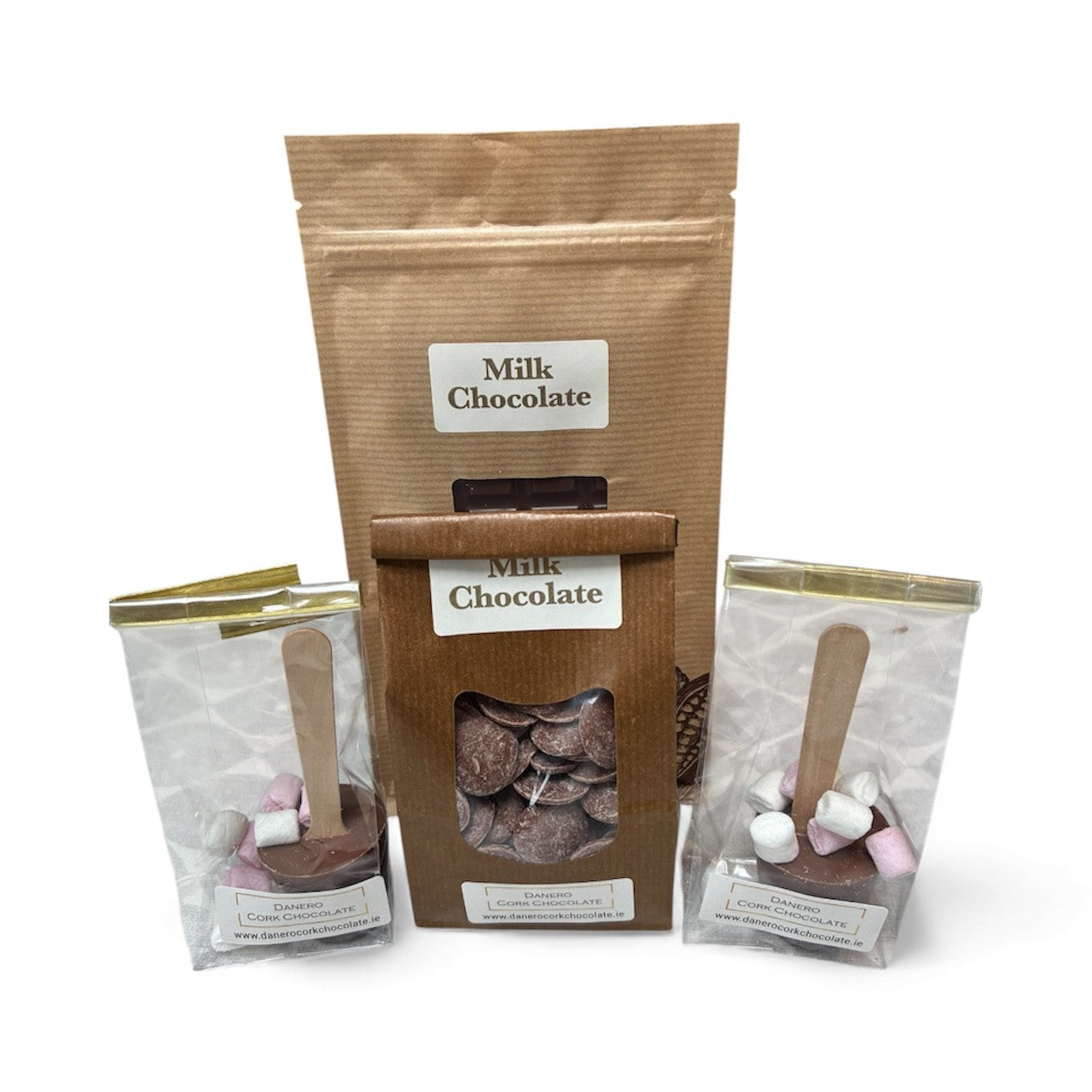 This ideal gift set contains a 200g bag of milk chocolate Belgian pellets ( perfect for snacking or melting down into delicious hot chocolate drinks), 2 chocolate stick donkers with marshmallows and an 80g bar of premium Belgian milk chocolate. All packed in a gift set with ribbon.